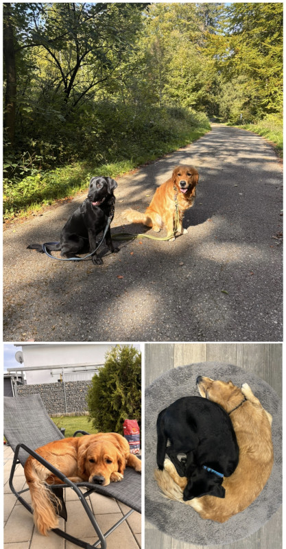 Bei mir zu Hause leben unsere Familienhunde Harley ein Golden Retriever und Whiskey ein Labrador Mischling. Diese Rassen gelten als ruhig, geduldig, aufmerksam und nicht aggressiv. Sie haben ein ausgeglichenes Wesen, eine gute Verträglichkeit mit Menschen insbesondere mit Kindern.